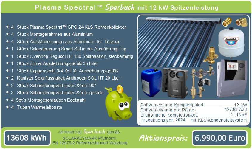1 | Plasma Spectral™ CPC Röhrenkollektor Röhrenkollektor Plasma Spectral CPC 24, Modellupgrade 2024 mit KLS Kondensleitsystem, Heatpipe Verdampfungsbeschleuniger, VVOC Fluid mit einer Starttemperatur von 35° C, CPC Reflektoren mit witterungsbeständiger Spezialbeschichtung, Nanoversiegelung mit einem Reflektionsgrad von 90%, Frostsicher bis -50° C, Sammlerkasten in wasserdichter Ausführung, Easyfix Röhrenaufnahmen aus witterungsbeständigen Polyamid, Montagerahmen aus gebürstetem Aluminium, Montageschrauben aus Edelstahl. Bruttofläche 5,12m², Absorberfläche: 6,02m², Aperturfläche: 4,41m², Abmessungen: (LxBxH) 1917x2670x133 mm, Anzahl der Röhren: 24 Stück, Anzahl der CPC Reflektoren: 24 Stück, Röhrenabstand: 110 mm, Durchmesser Sammlerrohr: 1 Zoll, Sammleranschluss: 22 mm Kupfer, Sammlerinhalt: 2,26 Liter, Prüfdruck: 10 Bar, Gewicht: 81 Kg., Spitzenleistung 3009 Wpeak, Solarkeymark zertifiziert, Bafa gelistet , Hagelprüfzertifikat und Drucklastzertifikat. | 4 Stk. | 1.690,00 | 6.760,00 |