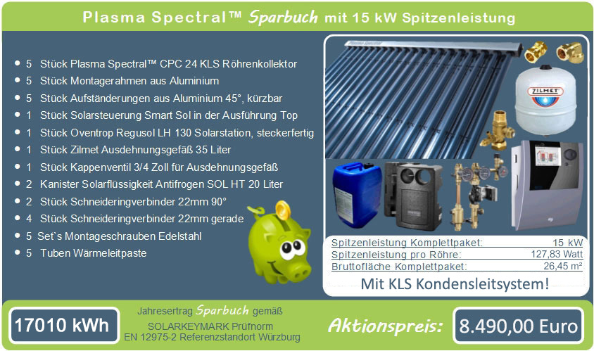 1 | Plasma Spectral™ CPC Röhrenkollektor Röhrenkollektor Plasma Spectral CPC 24, Modellupgrade 2026 mit KLS Kondensleitsystem, Heatpipe Verdampfungsbeschleuniger, VVOC Fluid mit einer Starttemperatur von 35° C, CPC Reflektoren mit witterungsbeständiger Spezialbeschichtung, Nanoversiegelung mit einem Reflexionsgrad von 90 %, Frostsicher bis -50° C, Sammlerkasten in wasserdichter Ausführung, Easyfix Röhrenaufnahmen aus witterungsbeständigen Polyamid, Montagerahmen aus gebürstetem Aluminium, Montageschrauben aus Edelstahl. Bruttofläche 5,12m², Absorberfläche: 6,02m², Aperturfläche: 4,41m², Abmessungen: (LxBxH) 1917x2670x133 mm, Anzahl der Röhren: 24 Stück, Anzahl der CPC Reflektoren: 24 Stück, Röhrenabstand: 110 mm, Durchmesser Sammlerrohr: 1 Zoll, Sammleranschluss: 22 mm Kupfer, Sammlerinhalt: 2,26 Liter, Prüfdruck: 10 Bar, Gewicht: 81 Kg., Spitzenleistung 3009 Wpeak, Solarkeymark zertifiziert, Bafa gelistet , Hagelprüfzertifikat und Drucklastzertifikat. | 5 Stk. | 1.690,00 | 8.450,00 |