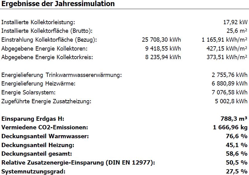 Die Berechnungen wurden mit dem von der Bafa zertifizierten und zur Förderung von Solaranlagen anerkannten Simulationsprogramm für thermische Solaranlagen T-SOL 2016 (R2) durchgeführt. Die Ergebnisse sind durch eine mathematische Modellrechnung mit einer variablen Zeitschrittweite von max. 6 Minuten ermittelt worden. Die tatsächlichen Erträge können aufgrund von Schwankungen des Wetters, des Verbrauchs und anderen Faktoren davon abweichen.