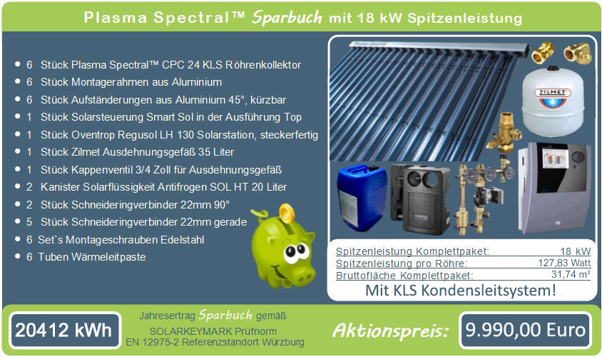 1 | Plasma Spectral™ CPC Röhrenkollektor Röhrenkollektor Plasma Spectral CPC 24, Modellupgrade 2026 mit KLS Kondensleitsystem, Heatpipe Verdampfungsbeschleuniger, VVOC Fluid mit einer Starttemperatur von 35° C , CPC Reflektoren mit witterungsbeständiger Spezialbeschichtung, Nanoversiegelung mit einem Reflexionsgrad von 90%, Frostsicher bis -50° C, Sammlerkasten in wasserdichter Ausführung, Easyfix Röhrenaufnahmen aus witterungsbeständigen Polyamid, Montagerahmen aus gebürstetem Aluminium, Montageschrauben aus Edelstahl. Bruttofläche 5,12m², Absorberfläche: 6,02m², Aperturfläche: 4,41m², Abmessungen: (LxBxH) 1917x2670x133 mm, Anzahl der Röhren: 24 Stück, Anzahl der CPC Reflektoren: 24 Stück, Röhrenabstand: 110 mm, Durchmesser Sammlerrohr: 1 Zoll, Sammleranschluss: 22 mm Kupfer, Sammlerinhalt: 2,26 Liter, Prüfdruck: 10 Bar, Gewicht: 81 Kg., Spitzenleistung 3009 Wpeak, Solarkeymark zertifiziert, Bafa gelistet , Hagelprüfzertifikat und Drucklastzertifikat. | 6 Stk. | 1.690,00 | 10.140,00 |