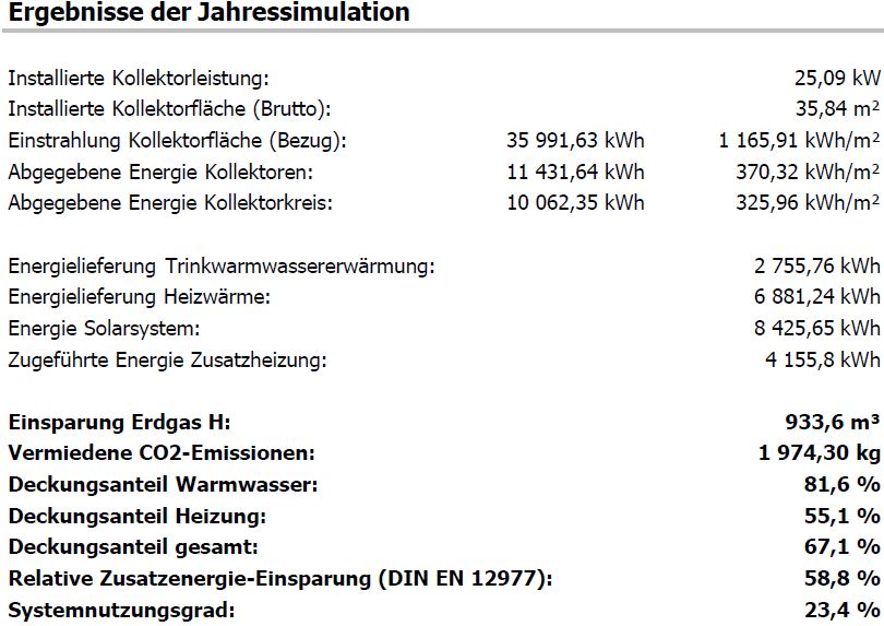 Die Berechnungen wurden mit dem von der Bafa zertifizierten und zur Förderung von Solaranlagen anerkannten Simulationsprogramm für thermische Solaranlagen T-SOL 2016 (R2) durchgeführt. Die Ergebnisse sind durch eine mathematische Modellrechnung mit einer variablen Zeitschrittweite von max. 6 Minuten ermittelt worden. Die tatsächlichen Erträge können aufgrund von Schwankungen des Wetters, des Verbrauchs und anderen Faktoren davon abweichen.
